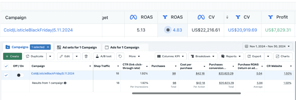 Отримали в Black Friday за рахунок Listicle чистий профіт $7,8K+ прибутку для косметичного бренду